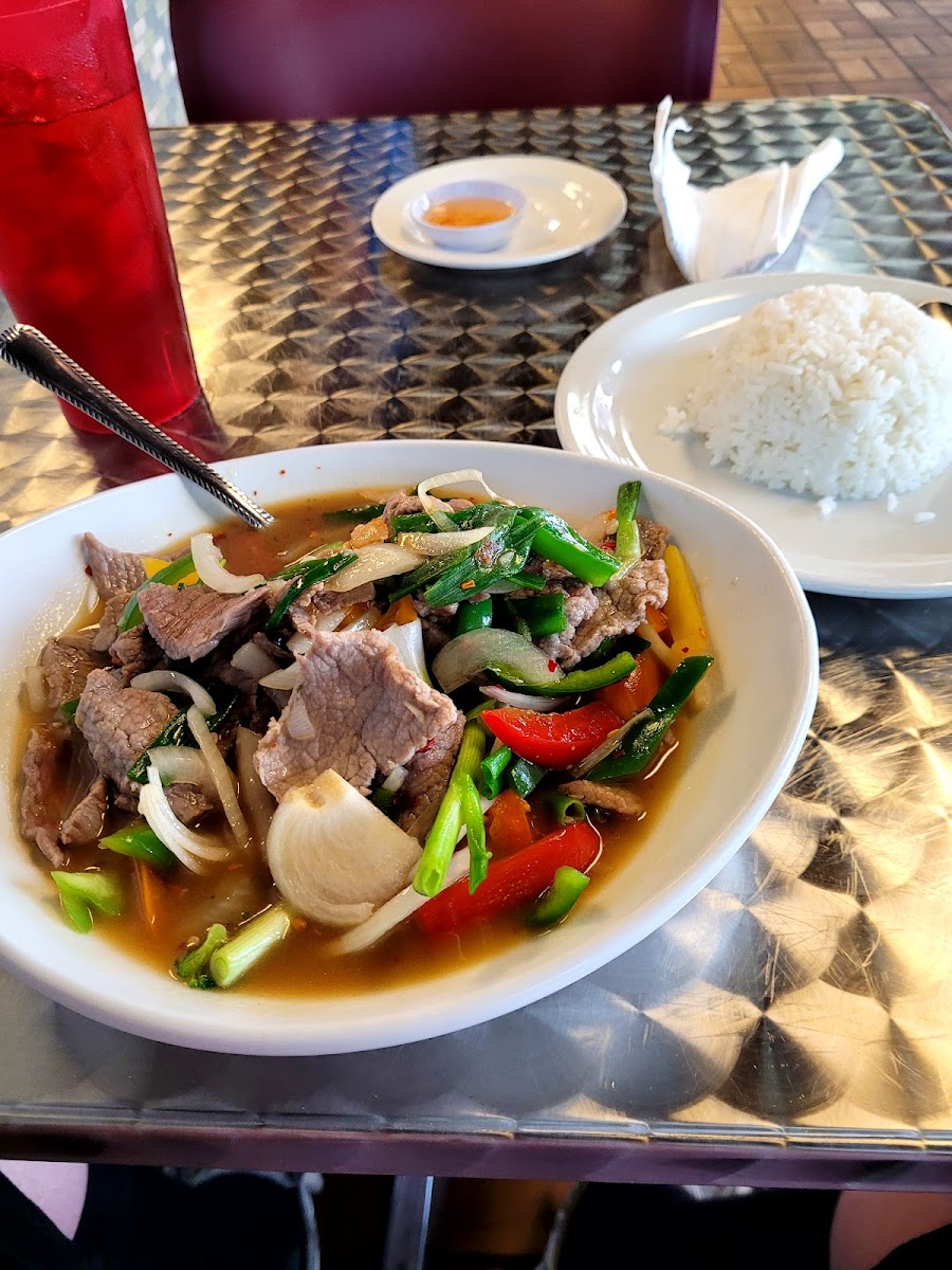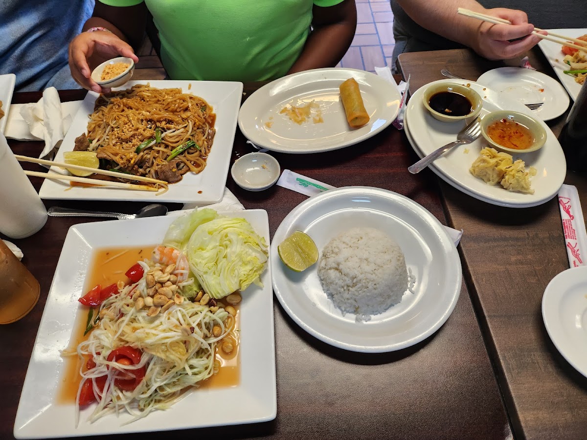 We were traveling from Austin to Dallas and wanted to have some Thai food. Upon arrival there was plenty of parking available. I ordered the Thai Tea to drink which I have had before. Personally it’s too sweet for me, so what I do is water it down so that it’s lighter on the sugar. I asked for an extra cup of water. I then ordered the Pad Thai which is my favorite when eating Thai food. I asked for Thai spicy and let me tell you their Thai spicy IS THAI SPICY, So if you eat spicy go for it . I absolutely loved the Pad Thai ! We also ordered the basil fried rice which was also good. For dessert we got the Mango sticky rice which is what we like to order when we eat Thai and it was delicious. Definitely recommend this place if you’re looking for a stop when on the road or in this area.